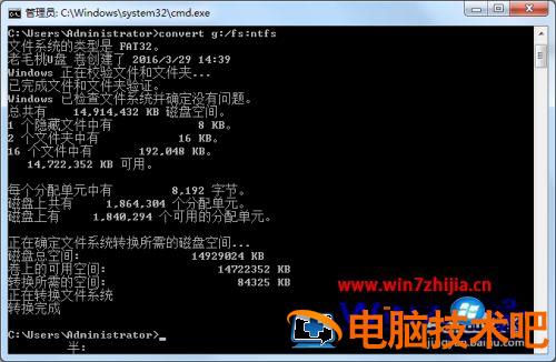6、等一会,不要操作,静等即可,当我们看到转换完成的提示,如下图最后一行所示。此时即大功告成了,我们可以放心的复制文件了,因为NTFS:最大文件2TB,只要U盘足够大,一般单个文件应该都能复制了。