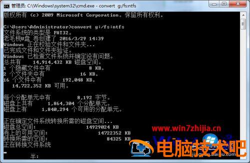 5、回车后,我们会看到当前U盘的一些信息,同时提示正在转换文件系统,如下图最后一行。