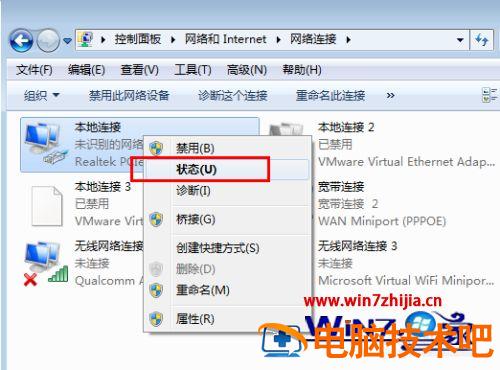 4、然后就能看到当前系统的网卡设备了,找到需要查看的网卡设备如“本地连接”选择“状态”可以查看网卡详细信息。