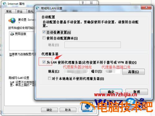 7、勾选”为LAN使用代理服务器”,填写IP地址和端口号等信息。