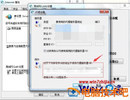 8、点击”高级“选项,输入例外情况(不适用代理的情况),包括域名,IP地址等,以”;”做间隔例如”localhost;*.local;192.168.*.*”,”*”代表全部的意思。