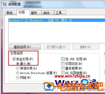 2、切换到“引导”选项卡,勾选“安全引导”和“最小化”两个项目,点击“确定”按钮;