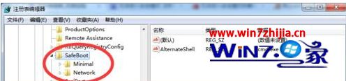 2、依次进入“HKEY_LOCAL_MACHINE\SYSTEM\CurrentControlSet\Control\SafeBoot”,在此可以看到“Minimal”及 “Network”项;