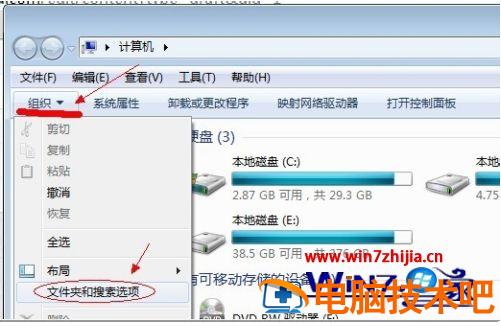 2、点击窗口顶部靠左位置的“组织”菜单,选择其中的“文件夹和搜索选项”。