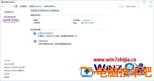 6、在网络和共享中心的左侧菜单中找到更改高级共享设置,点击进入设置。