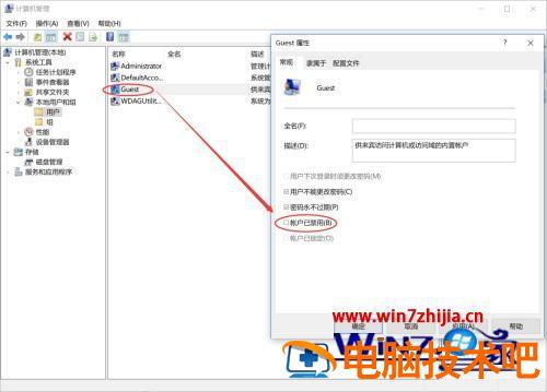 3、双击 Guest 账户进入 Guest 属性,将账户已禁用前面的勾去掉,然后确认退出。