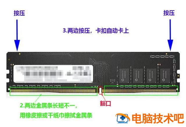 1.用橡皮擦或干纸巾擦拭金属条。2.内存条开口与主机卡槽开口对接。3.向下按压卡扣,自动扣上
