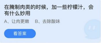 在小鸡庄园中玩家可以通过答题来获得小鸡饲料,那么7月12日更新的问题及相关答案分别是什么呢?小鸡庄园7月12日更新的问题是“在腌制肉类的时候加一些柠檬汁会有什么妙用”和“在野外看到形似桑葚的小野果可以摘来吃吗”,前一个问题的答案是为了让肉更嫩,后一个问题的答案是有风险、最好不要。小鸡庄园最新的答案7.12:问题:在腌制肉类的时候加一些柠檬汁会有什么妙用?答案:让肉更嫩解析:柠檬使肉变嫩其原理是檬中